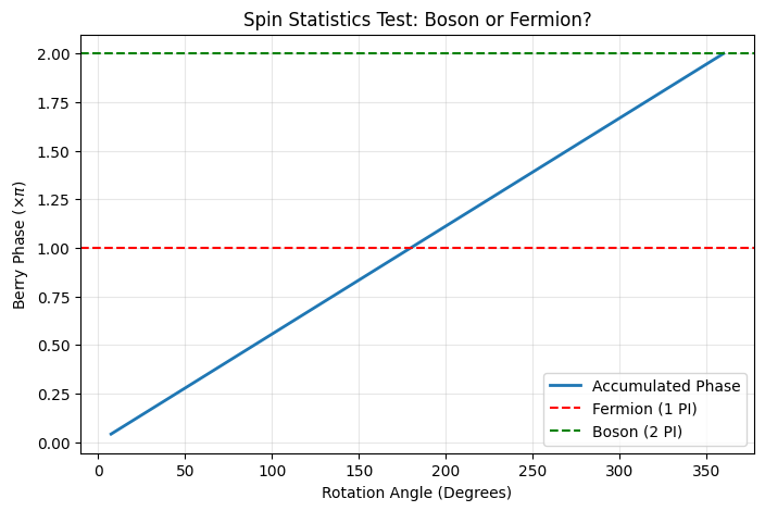 import numpy as npimport matplotlib.pyplot as plt# 1. CONFIGURACIÓN DE LA REJILLAN =64L =8.0x = np.linspace(-L/2, L/2, N)y = np.linspace(-L/2, L/2, N)z = np.linspace(-L/2, L/2, N)X, Y, Z = np.meshgrid(x, y, z, indexing='ij')dV = (L/N)**3# 2. DEFINICIÓN DEL HOPFIÓN ROTADOdef get_hopfion(angle_z): c, s = np.cos(angle_z), np.sin(angle_z) Xr = X * c - Y * s Yr = X * s + Y * c Zr = Z R_sq = Xr**2+ Yr**2+ Zr**2# Mapa de Hopf (Q=1) Numerator =2* (Xr +1j* Yr) Denominator =2* Zr +1j* (R_sq -1.0) Psi_raw = Numerator / Denominator# Perfil de densidad Mag = np.abs(Psi_raw) Density = (Mag**2) / ((1+ Mag**2)**2) Psi = np.sqrt(Density) * np.exp(1j* np.angle(Psi_raw)) Norm = np.sqrt(np.sum(np.abs(Psi)**2) * dV)return Psi / Norm# 3. BUCLE DE ROTACIÓN ADIABÁTICAsteps =50angles = np.linspace(0, 2*np.pi, steps)berry_phase_accum =0.0phases = []Psi_current = get_hopfion(angles[0])for i inrange(1, steps): Psi_next = get_hopfion(angles[i]) overlap = np.sum(np.conj(Psi_current) * Psi_next) * dV d_phase = np.angle(overlap) berry_phase_accum += d_phase phases.append(berry_phase_accum) Psi_current = Psi_next# 4. RESULTADOS Y GRÁFICAtotal_phase_pi = berry_phase_accum / np.piprint(f"Accumulated Phase: {total_phase_pi:.4f} * PI")fig, ax = plt.subplots(figsize=(8, 5))ax.plot(np.degrees(angles[1:]), np.array(phases) / np.pi, label='Accumulated Phase', linewidth=2)ax.axhline(1.0, color='r', linestyle='--', label='Fermion (1 PI)')ax.axhline(2.0, color='g', linestyle='--', label='Boson (2 PI)')ax.set_xlabel('Rotation Angle (Degrees)')ax.set_ylabel(r'Berry Phase ($\times \pi$)')ax.set_title('Spin Statistics Test: Boson or Fermion?')ax.legend()ax.grid(True, alpha=0.3)plt.close(fig) fig