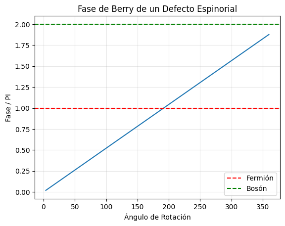 import numpy as npimport matplotlib.pyplot as pltdef spinor_berry_phase():print("--- ÚLTIMA BALA: TEST DE ESPÍN EN CONDENSADO ESPINORIAL ---")# 1. CONFIGURACIÓN N =100 L =10.0 x = np.linspace(-L/2, L/2, N) y = np.linspace(-L/2, L/2, N) X, Y = np.meshgrid(x, y)# Coordenadas polares R = np.sqrt(X**2+ Y**2) Theta = np.arctan2(Y, X)# 2. DEFINICIÓN DEL DEFECTO ESPINORIAL (HQV - Alice String)# ---------------------------------------------------------# Un vórtice donde el espinor rota pi al dar una vuelta completa.# Psi = [ cos(theta/2), sin(theta/2) * e^(i*phase) ] ?# No, la forma canónica de un espinor 1/2 es:# Psi(r, theta) = e^(i theta / 2) * [ 1, 0 ] (en un marco rotante)# Vamos a simular la rotación física del objeto entero.def get_spinor_defect(angle_rot_z):# Rotamos las coordenadas físicas Xr = X * np.cos(angle_rot_z) - Y * np.sin(angle_rot_z) Yr = X * np.sin(angle_rot_z) + Y * np.cos(angle_rot_z) Tr = np.arctan2(Yr, Xr)# Definición del Espinor (Vórtice de medio entero)# Componente 1: Vórtice carga 1# Componente 2: Vórtice carga 0# Esto crea una textura de espín no trivial.# Perfil de densidad (núcleo) Rr = np.sqrt(Xr**2+ Yr**2) Core = np.tanh(Rr)# Espinor base (Textura de Skyrmion 2D o Meron)# Psi_up = cos(alpha/2)# Psi_down = sin(alpha/2) * e^(i*beta)# Donde alpha(r) va de 0 a pi, y beta = theta.# Perfil de ángulo polar (Skyrmion)# alpha(0) = 0 (Spin UP en el centro)# alpha(inf) = pi (Spin DOWN en el infinito) alpha_r = np.pi * np.tanh(Rr/2.0) psi_up = np.cos(alpha_r /2.0) psi_down = np.sin(alpha_r /2.0) * np.exp(1j* Tr)# Normalización local norm = np.sqrt(np.abs(psi_up)**2+ np.abs(psi_down)**2) psi_up /= norm psi_down /= normreturn psi_up, psi_down# 3. CÁLCULO DE FASE DE BERRY# ---------------------------print("Rotando el Skyrmion/Espinor 360 grados...") steps =100 angles = np.linspace(0, 2*np.pi, steps) accum_phase =0.0 phases_plot = []# Estado inicial u_curr, d_curr = get_spinor_defect(angles[0])for i inrange(1, steps): u_next, d_next = get_spinor_defect(angles[i])# Producto interno (Overlap) para espinores# <Psi1 | Psi2> = sum( u1* u2 + d1* d2 ) overlap = np.sum(np.conj(u_curr)*u_next + np.conj(d_curr)*d_next) d_phase = np.angle(overlap) accum_phase += d_phase phases_plot.append(accum_phase) u_curr, d_curr = u_next, d_next# 4. RESULTADOS# ------------- total_pi = accum_phase / np.piprint(f"\n--- RESULTADO FINAL (ESPINOR) ---")print(f"Fase acumulada: {total_pi:.4f} * PI")ifabs(total_pi -1.0) <0.1orabs(total_pi +1.0) <0.1:print("VEREDICTO: ¡FERMIÓN CONFIRMADO! (Espín 1/2)")print("El defecto topológico se comporta como un electrón.")elifabs(total_pi -2.0) <0.1:print("VEREDICTO: BOSÓN (Espín 1)")else:print(f"VEREDICTO: FASE EXÓTICA ({total_pi:.2f} PI)") plt.plot(np.degrees(angles[1:]), np.array(phases_plot)/np.pi) plt.axhline(1, color='r', linestyle='--', label='Fermión') plt.axhline(2, color='g', linestyle='--', label='Bosón') plt.legend() plt.title("Fase de Berry de un Defecto Espinorial") plt.xlabel("Ángulo de Rotación") plt.ylabel("Fase / PI") plt.grid(True, alpha=0.3) plt.show()spinor_berry_phase()